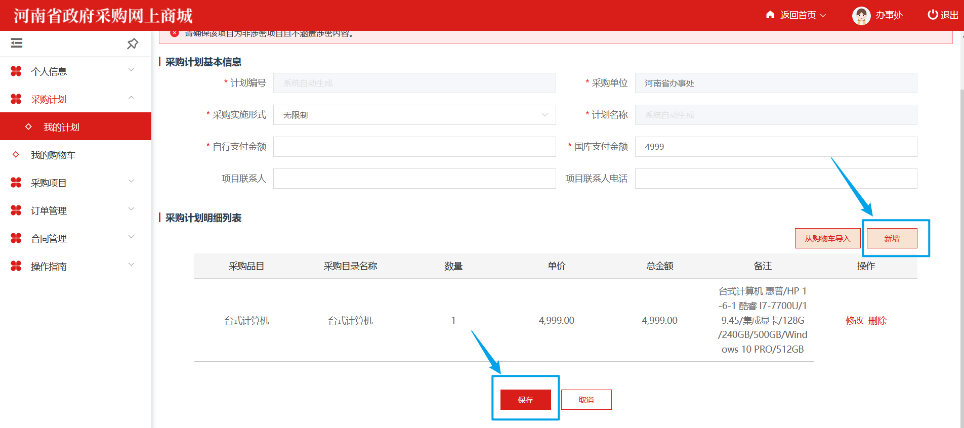 步骤四、 录入采购计划明细列表。点击【新增】按钮,选择相应的采购品目,填写采购数量及单价等相关信息,点击【保存】按钮完成采购计划明细录入。