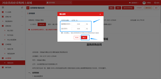 - 若合同内容无误则采购人可直接点击【确认】按钮进行合同确认。系统会出现弹窗,采购人需选择支付方式并填写支付金额。