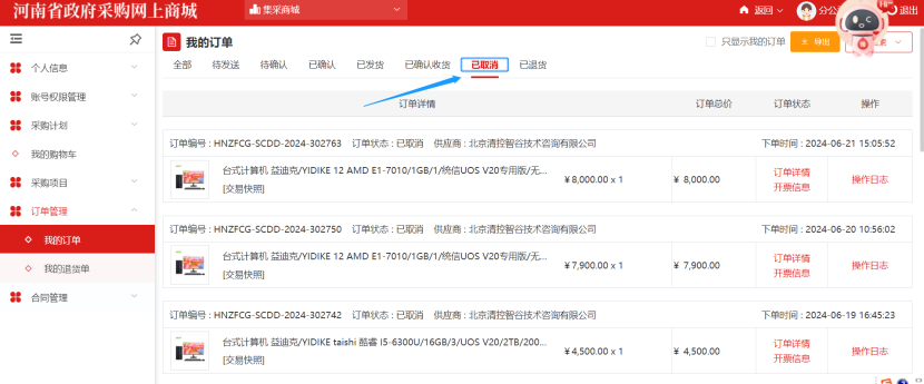 发起订单后,在经销商未确认订单时,采购人可取消订单,点击【取消订单】后,该订单被取消,可在【已取消】中查看。